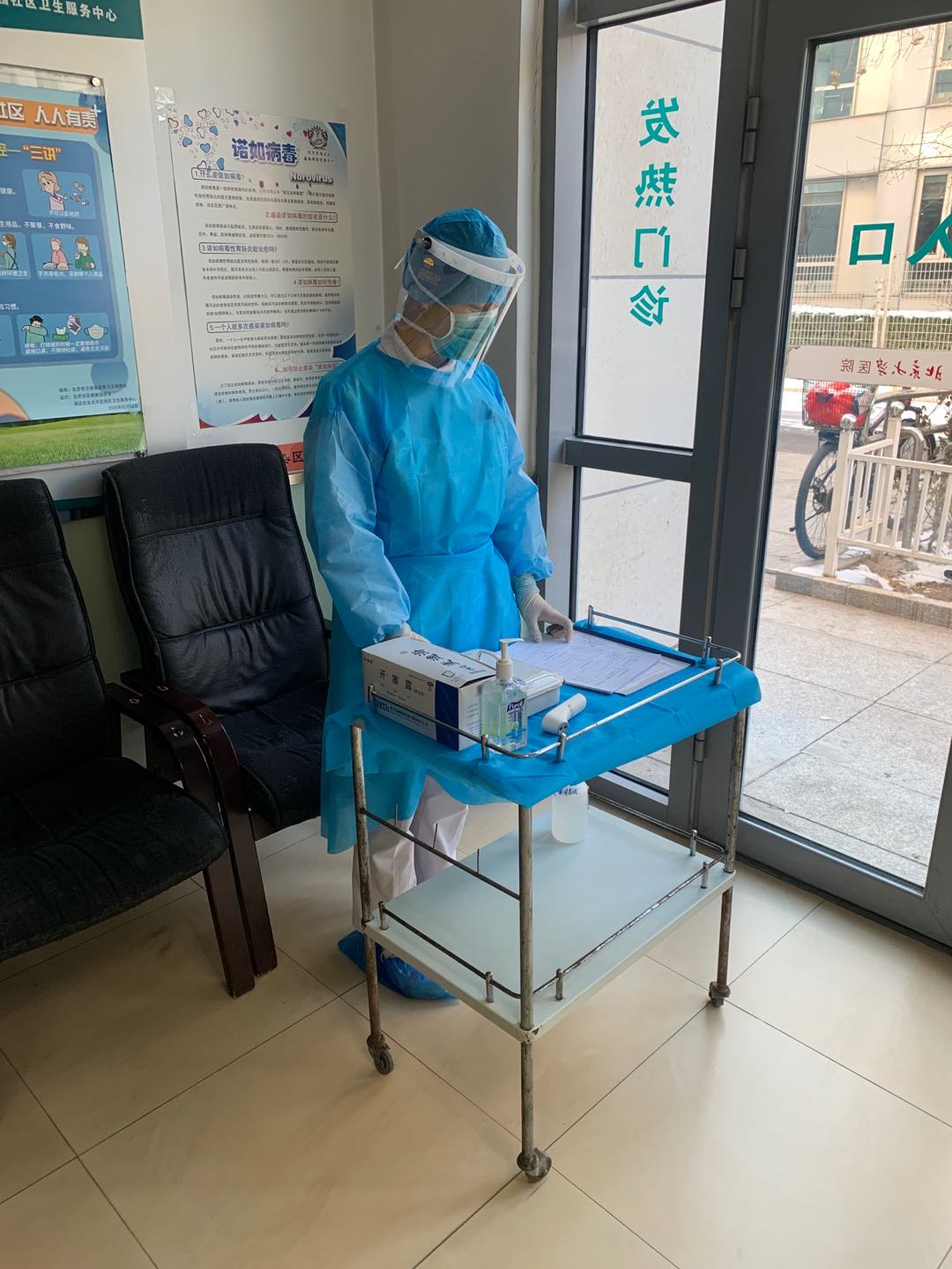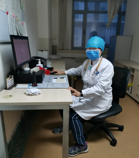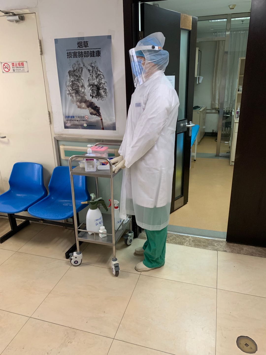 在这段特殊日子里,佩戴N95口罩、帽子、护目镜、面罩、橡胶手套,穿隔离防护服及鞋套,是发热门诊医护人员每天在接诊前的首要工作。在防护物资紧缺的情况下,内科主任李卫菊带领内科团队开动脑筋,利用连帽雨衣自制防护服。这套防护装备的防护性虽然很好,但是透气性确实不佳。大多数大夫本身还佩戴着眼镜,当穿起这套防护装备后,就不能自由转动头部,视野变得非常狭窄,有时候哈气在眼镜上聚集,看清电脑屏幕都很困难。为了避免上述情况,就会把室内暖风开大,大家常常会发现自己头发湿漉、浑身湿透,但是为了患者和自身的防控安全,必须每天坚持。