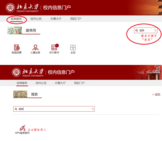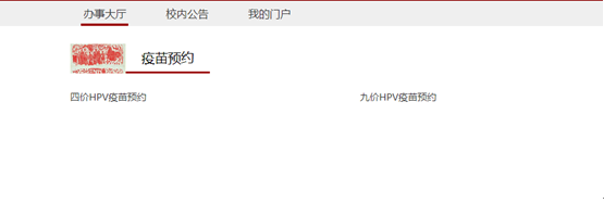 登录北京大学校内信息门户(https://portal.pku.edu.cn),搜索关键字“疫苗”,搜索到“HPV疫苗预约”功能后点击进入。