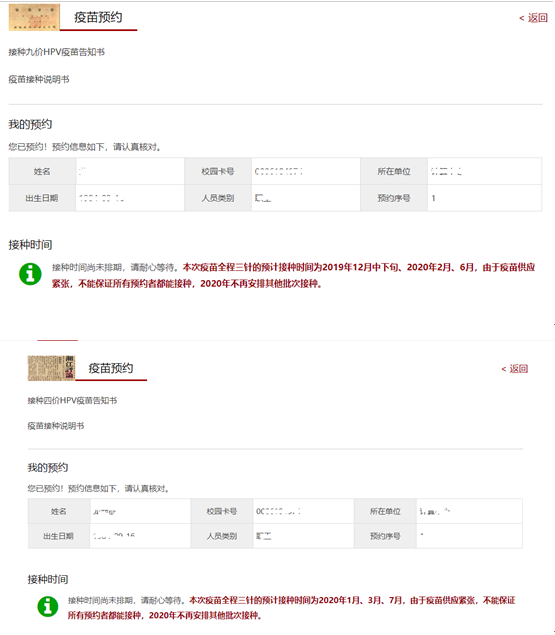 预约成功后,接种通知在微信公众号“疫苗与健康”及校内门户“HPV疫苗预约”中发布,将一次性公布三针接种时间,第2、第3针不再通知,请您自己在手机上设置提醒。
