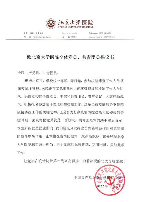 2022年5月22日晚,北京大学医院党委再次吹响抗疫集结号。